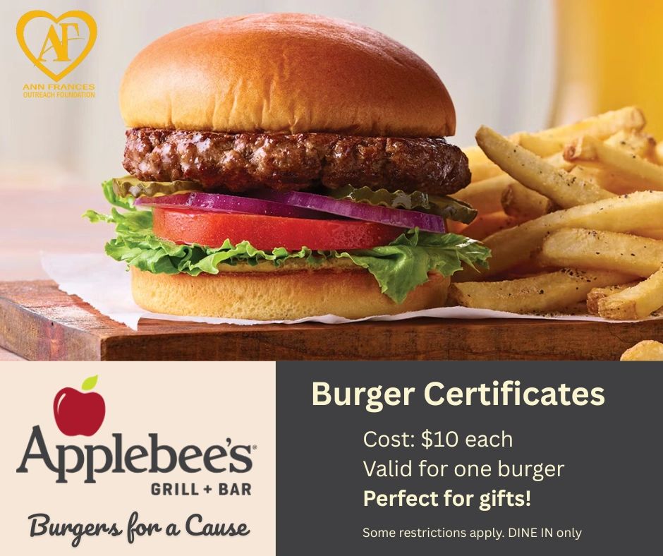 This is a delicious way to make a difference. Enjoy Applebee’s burgers with family or friends while supporting the Ann Frances Outreach Foundation in addressing the root causes of housing insecurity.